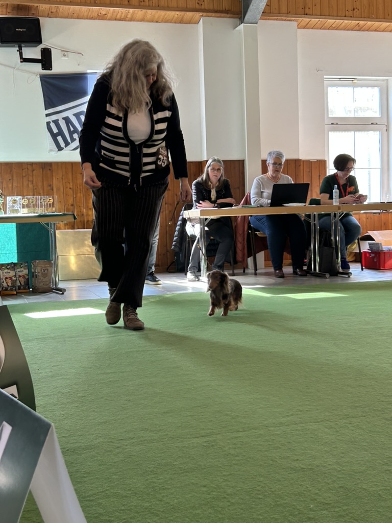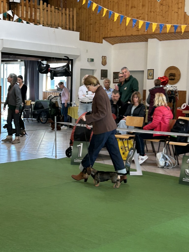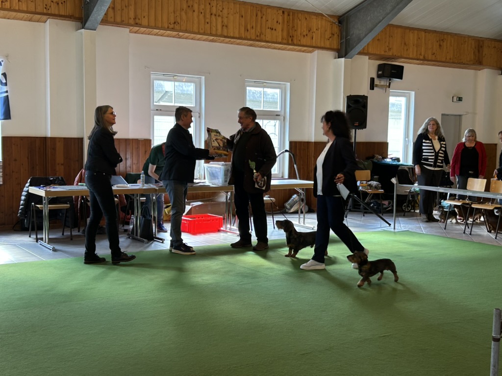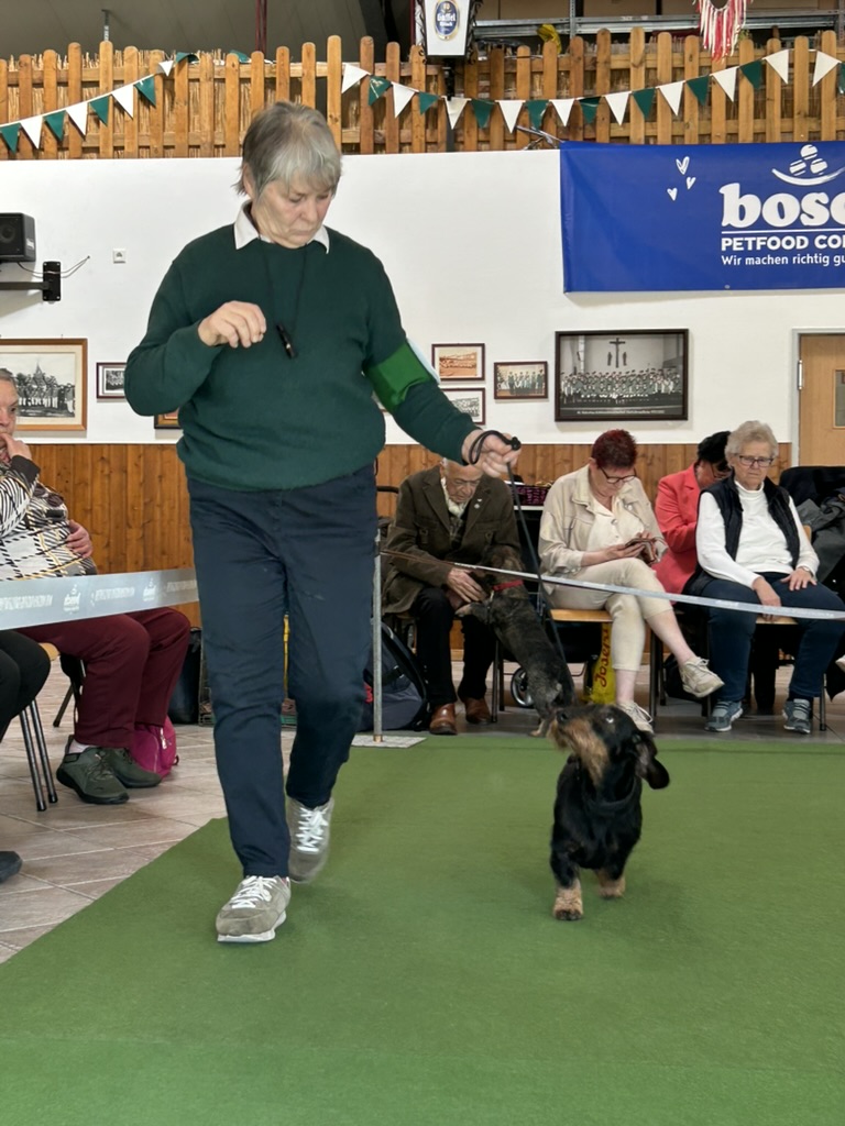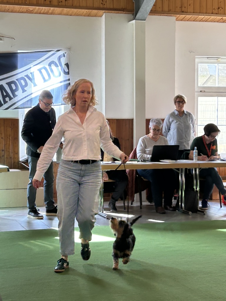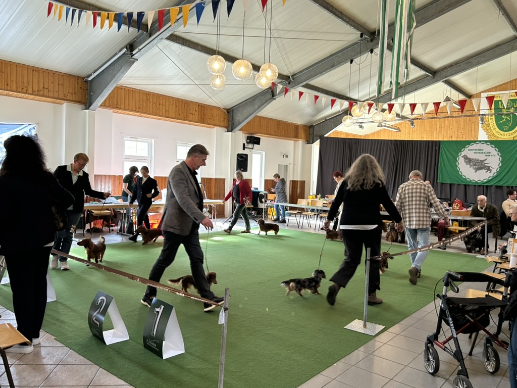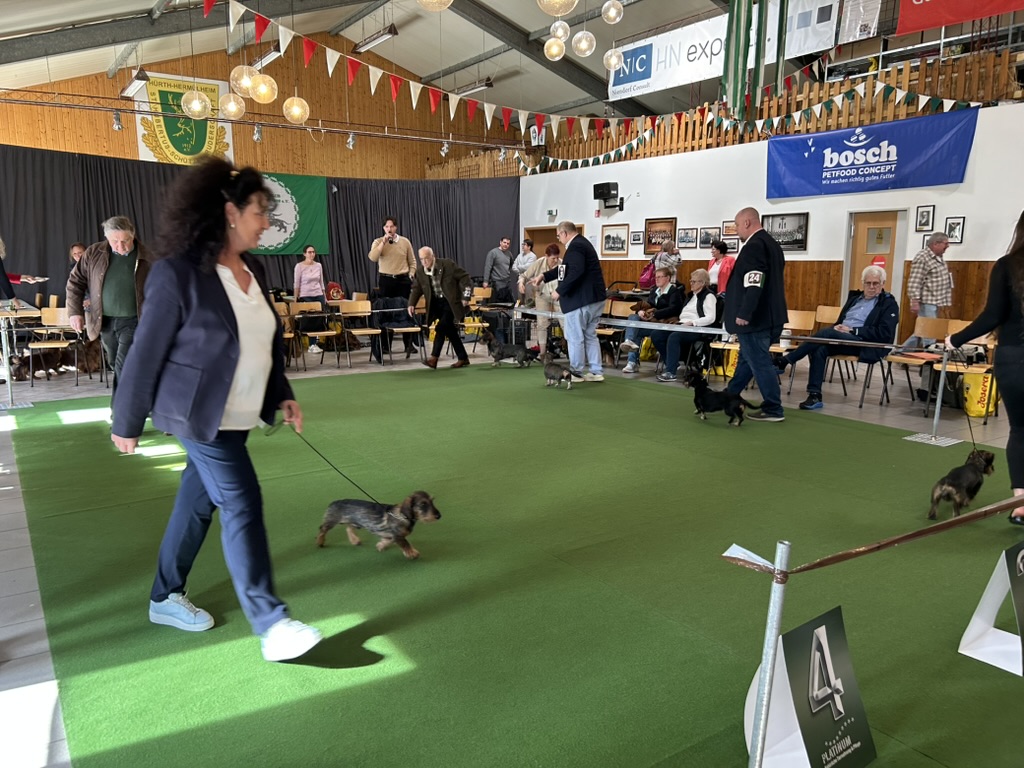 Am Sonntag ging es bei der Spezial-Ausstellung dann um Anwartschaften, Pokale und Medaillen. Wieder führte Anja Pusch souverän Regie im Ring. 47 gemeldete Hunde wurden nach Haarart, Größe und Klasse bewertet – von Kurzhaar über Rauhaar bis Langhaar. Nach der Pflicht folgte die Kür: