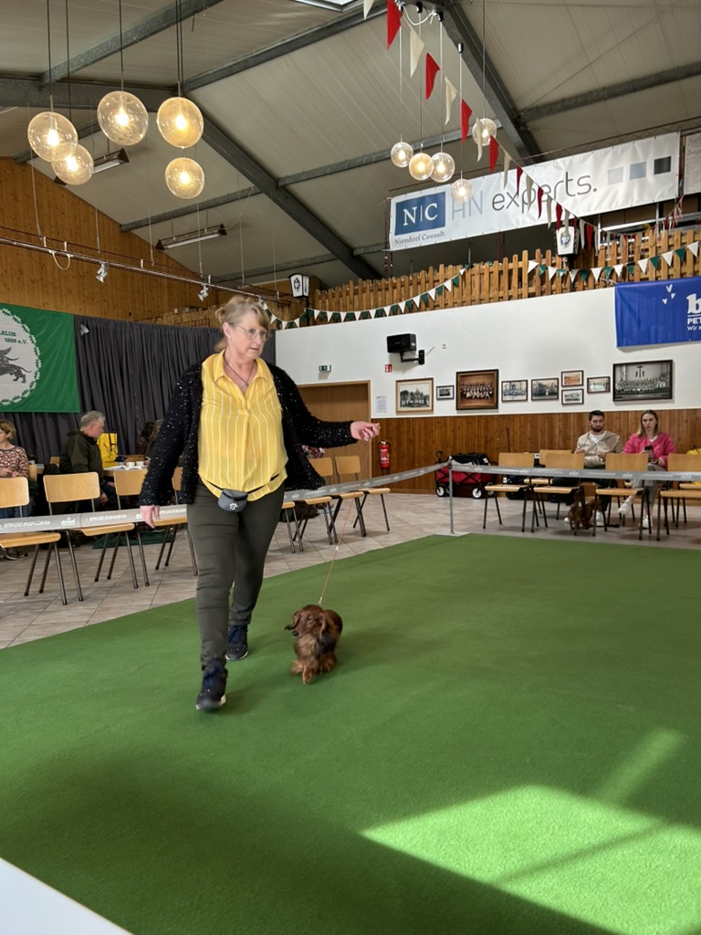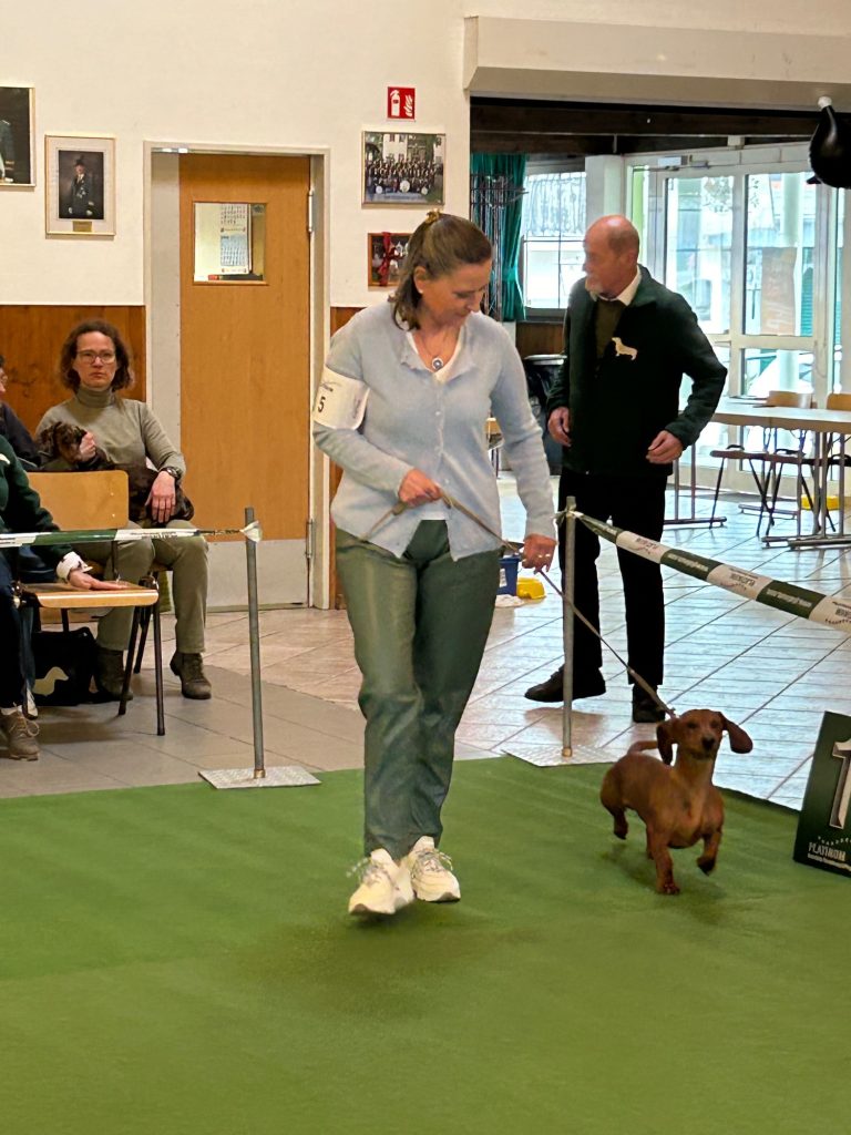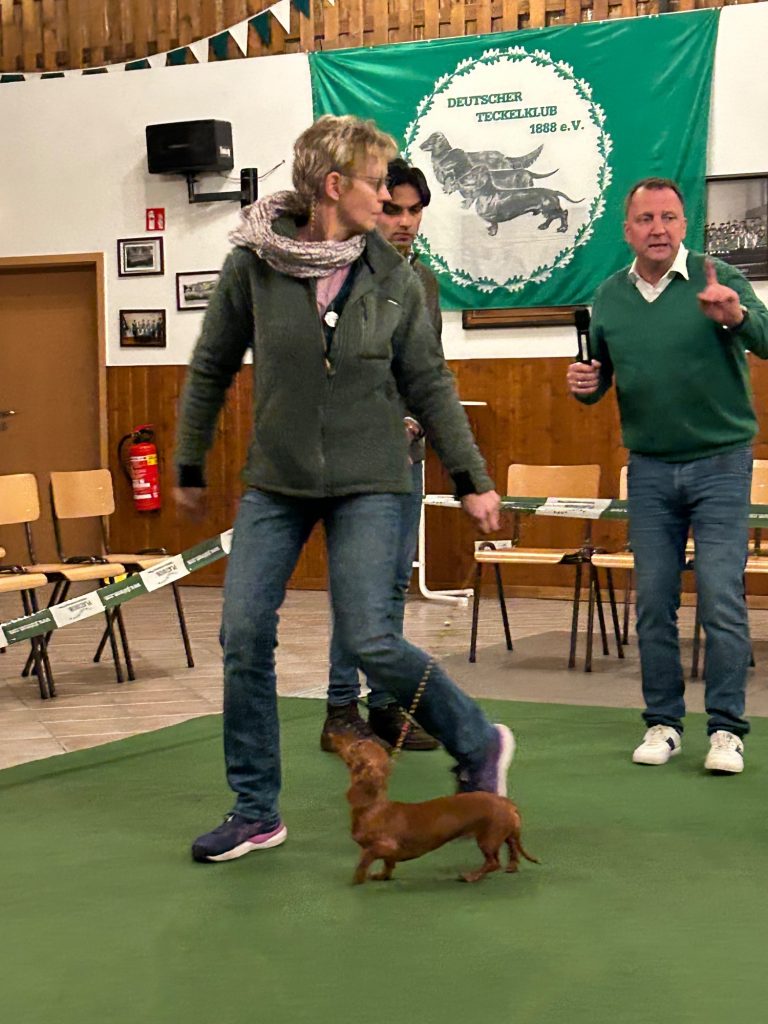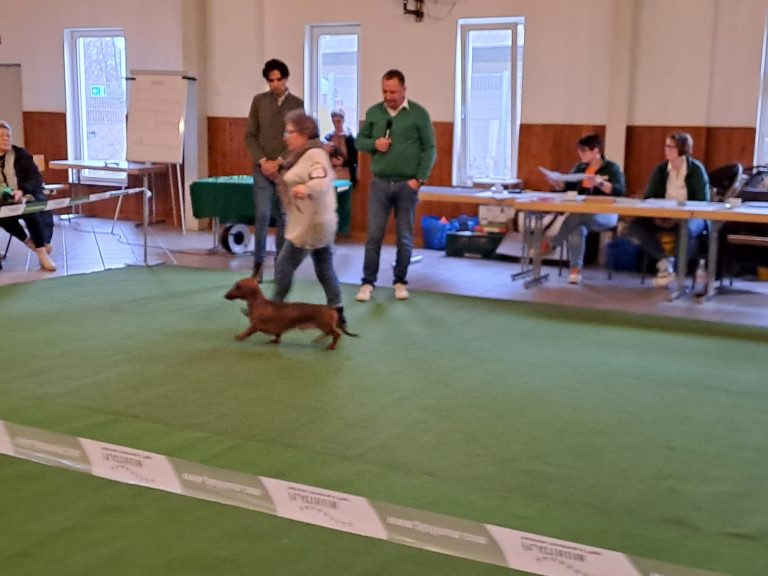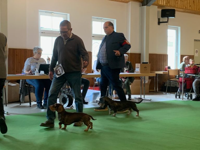 Doch es sollte sich auszahlen – es wurden insgesamt 103 Teckel aller Größen und Haararten ausgestellt: zur Zuchtschau am Samstag kamen 32 Teckel und 71 Teckel – davon einige sogar aus Frankreich – wurden am Sonntag von ihren Besitzern präsentiert und liefen so um Formwerte, Titel, Anwartschaften und Pokale. An beiden Tagen richtete die erfahrene und einfühlsame Richterin Astrid Küppenbender.