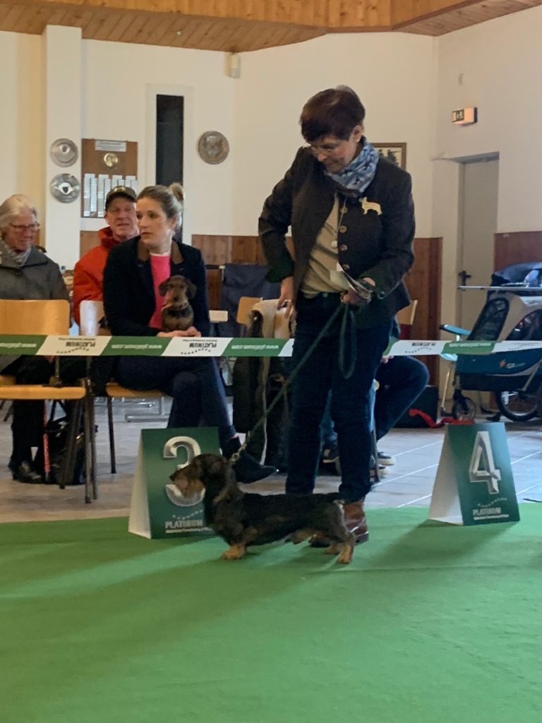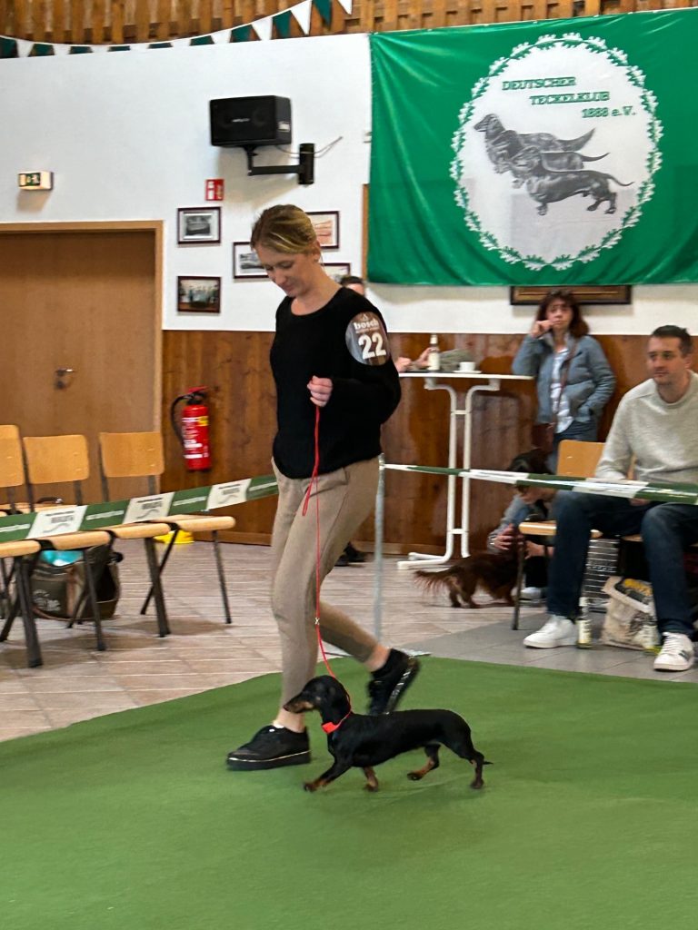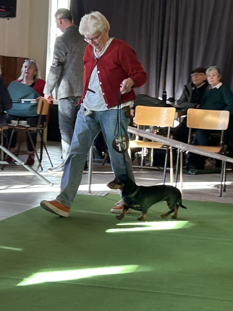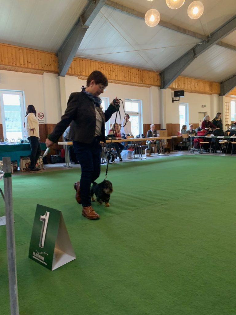 Doch es sollte sich auszahlen – es wurden insgesamt 103 Teckel aller Größen und Haararten ausgestellt: zur Zuchtschau am Samstag kamen 32 Teckel und 71 Teckel – davon einige sogar aus Frankreich – wurden am Sonntag von ihren Besitzern präsentiert und liefen so um Formwerte, Titel, Anwartschaften und Pokale. An beiden Tagen richtete die erfahrene und einfühlsame Richterin Astrid Küppenbender.