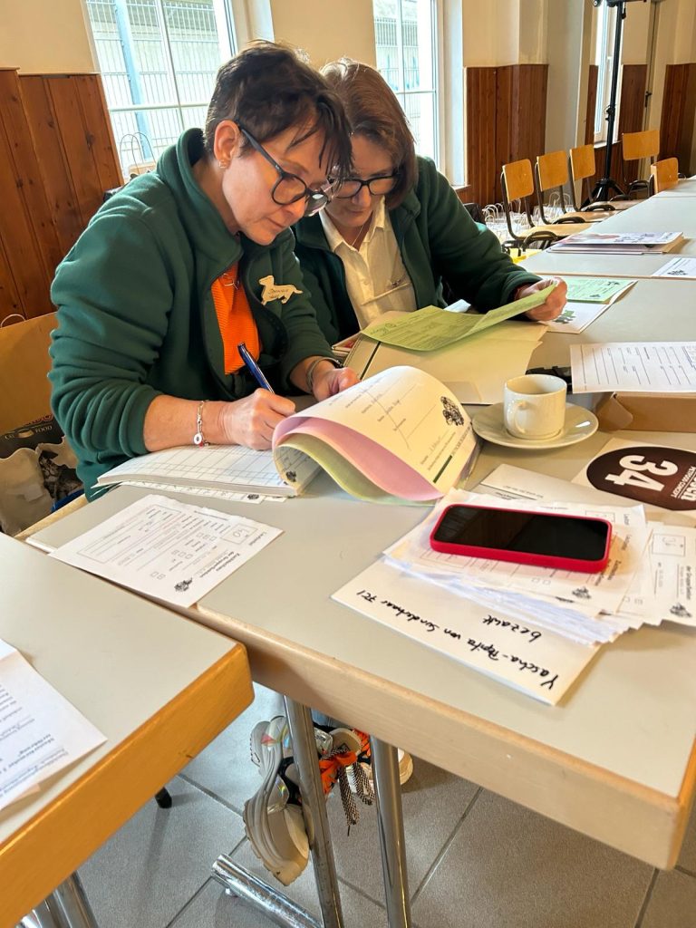 "Da kommen ja immer mehr und melden sich zur Zuchtschau an," kommentiert unser 1. Vorsitzender, Horst Schramm, das Geschehen am Zuchtschau-Samstag. Auch Ausstellungsleiterin, Melanie Hüttenmeister, und DTK-Richter, Dirk Topel, gucken nur noch ungläubig auf den stetig wachsenden Ausstellungsmappenberg. 10, 25, 30, 36, 43 und noch kein Ende in Sicht - insgesamt wurden 61 (!!!) Teckel am Samstag, 2. März 2024 auf ihre Zuchttauglichkeit geprüft und bewertet. So viele wie noch nie!