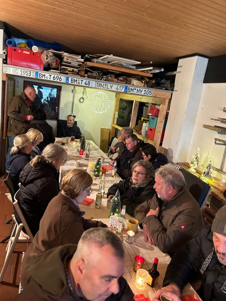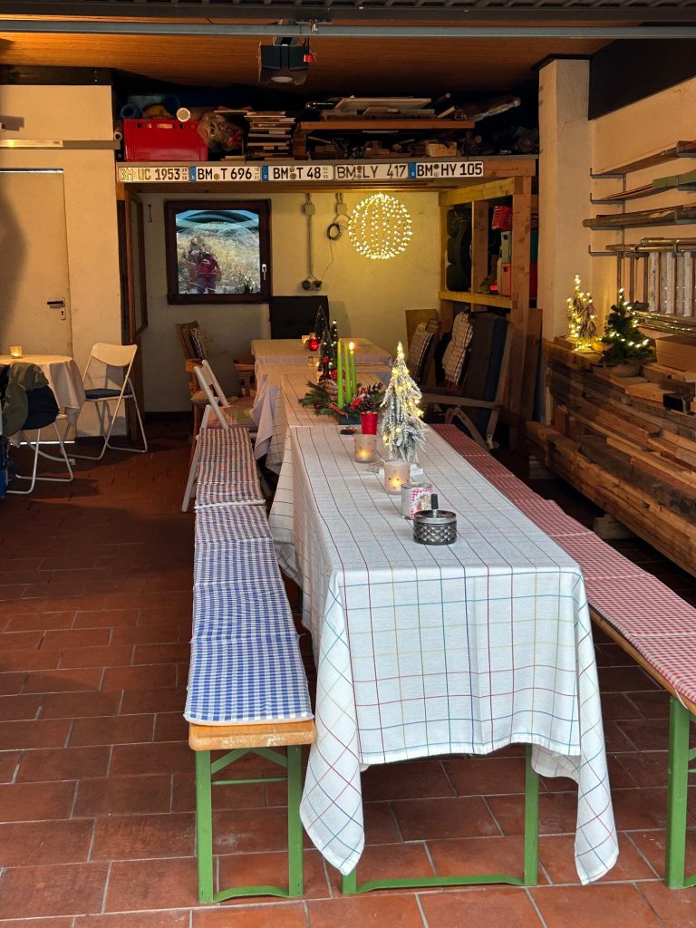 Zum Jahresabschluss hatten sie ihre Garage freigeräumt und für 26 Personen und 12 Teckel den Tisch weihnachtlich gedeckt.